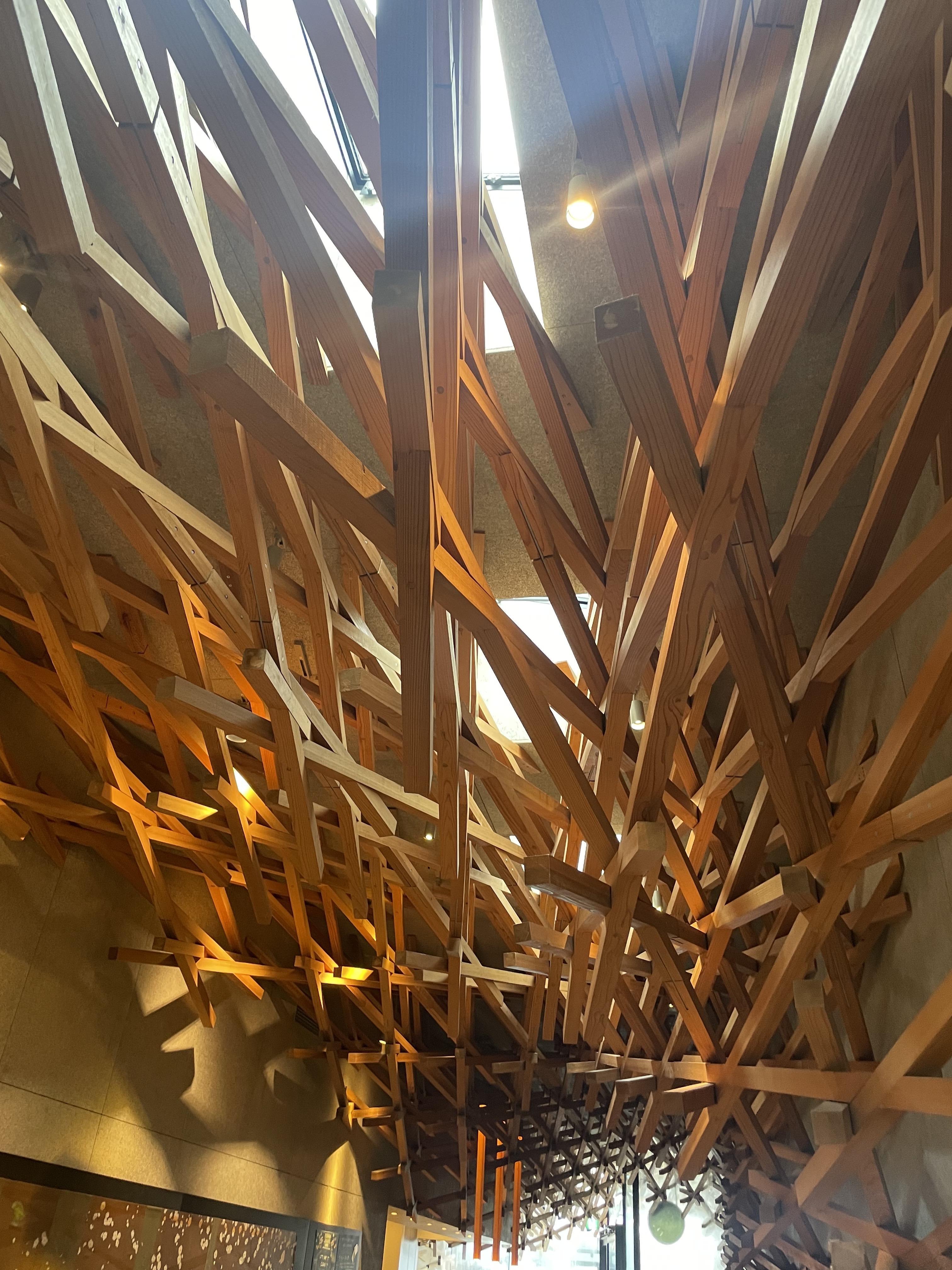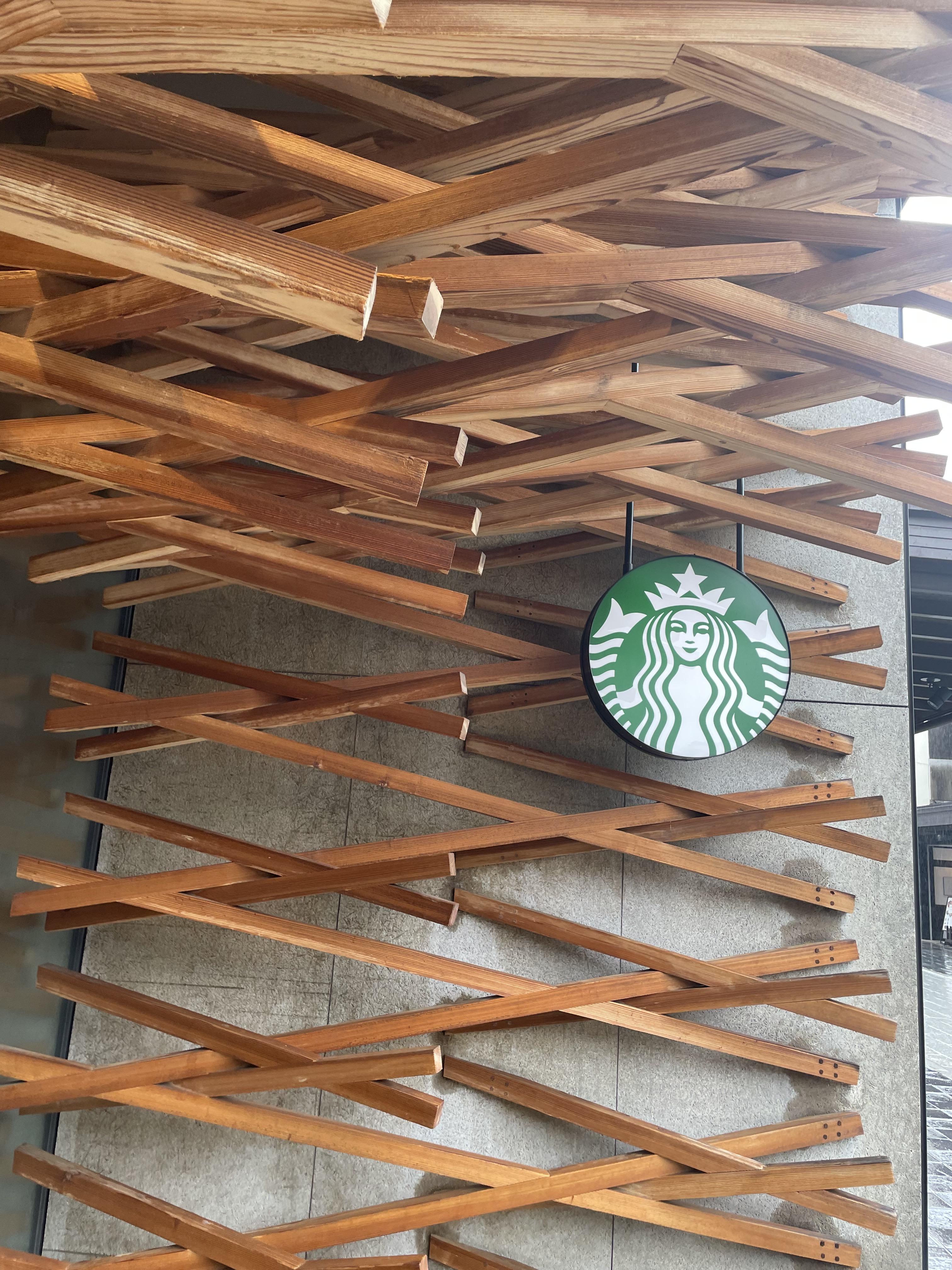 신사로 올라가는 길에 스타벅스 컨셉 스토어가 있다. 일본 건축가 쿠마 겐고가 설계한 곳인데, 새둥지처럼 서로 엮여있는 독특한 목조 구조가 특징이다. 비도 오고 내부 조명이 엄청 밝지 않아서 뭔가 숲 들어온 느낌이 났다.